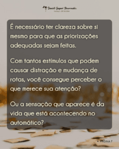 É necessário ter clareza sobre si mesmo para que as priorizações adequadas sejam feitas. Com tantos estímulos que podem causar distração e mudança de rotas, você consegue perceber o que merece sua atenção? Ou a sensação que aparece é da vida que está acontecendo no automático?