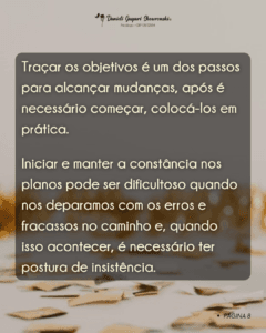 Traçar os objetivos é um dos passos para alcançar mudanças, após é necessário começar, colocá-los em prática. Iniciar e manter a constância nos planos pode ser dificultoso quando nos deparamos com os erros e fracassos no caminho e, quando isso acontecer, é necessário ter postura de insistência.