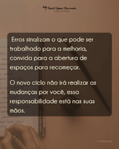 Erros sinalizam o que pode ser trabalhado para a melhoria, convida para a abertura de espaços para recomeçar. O novo ciclo não irá realizar as mudanças por você, essa responsabilidade está nas suas mãos.